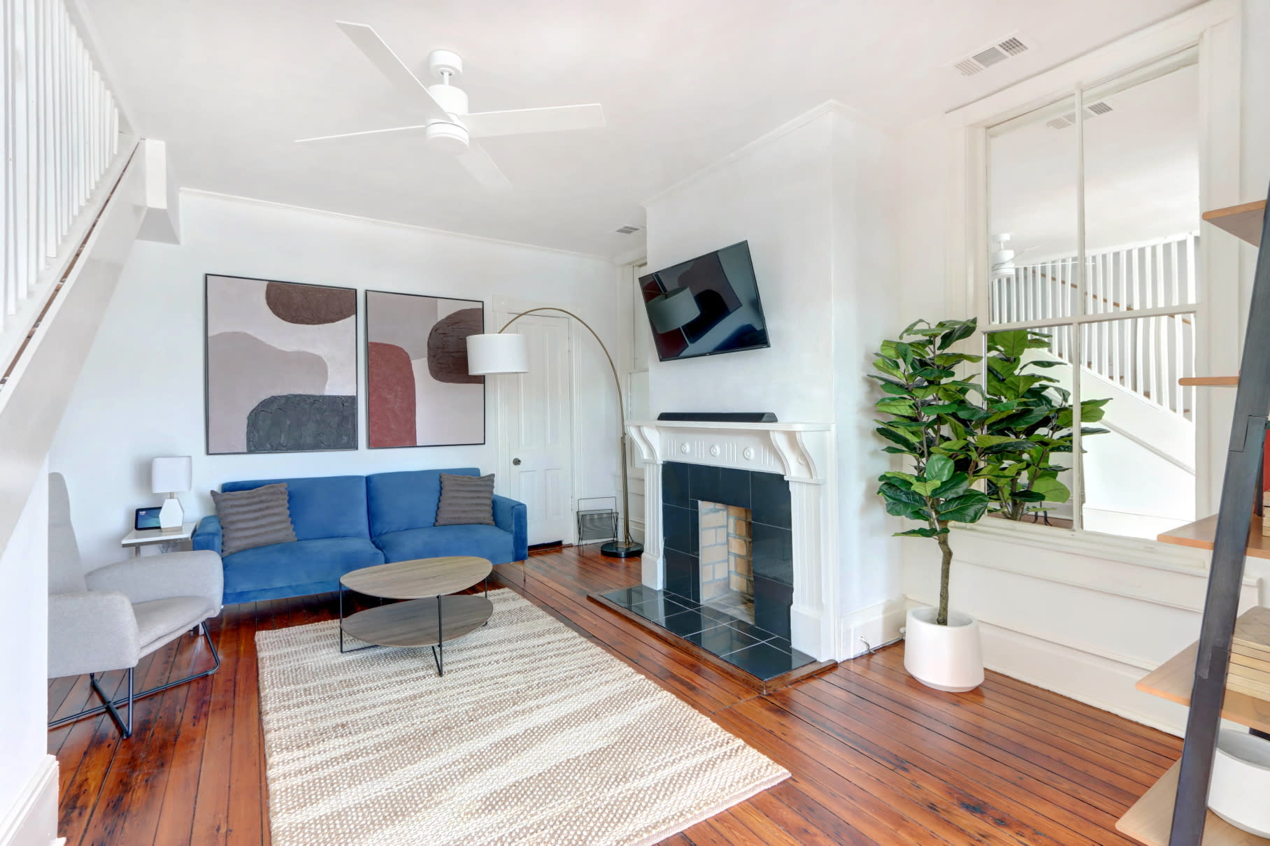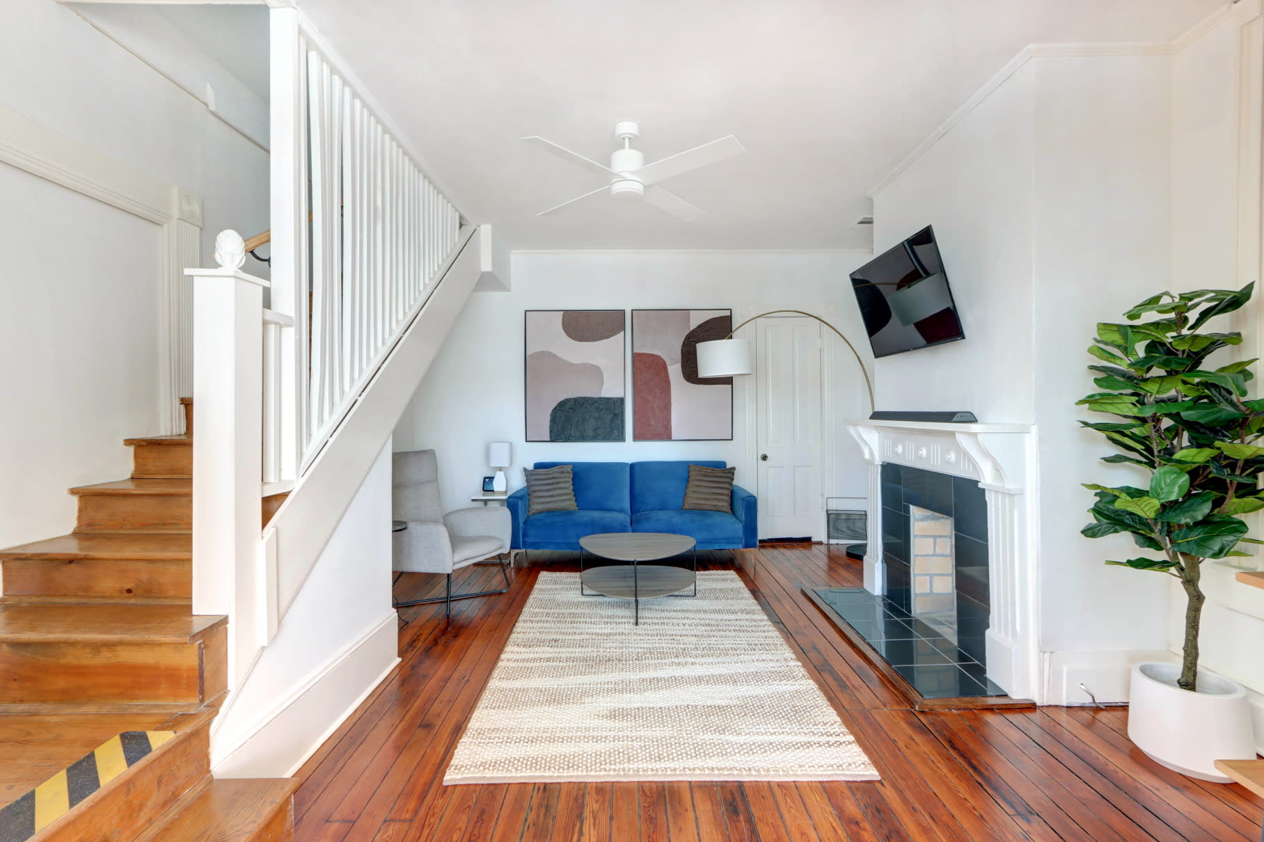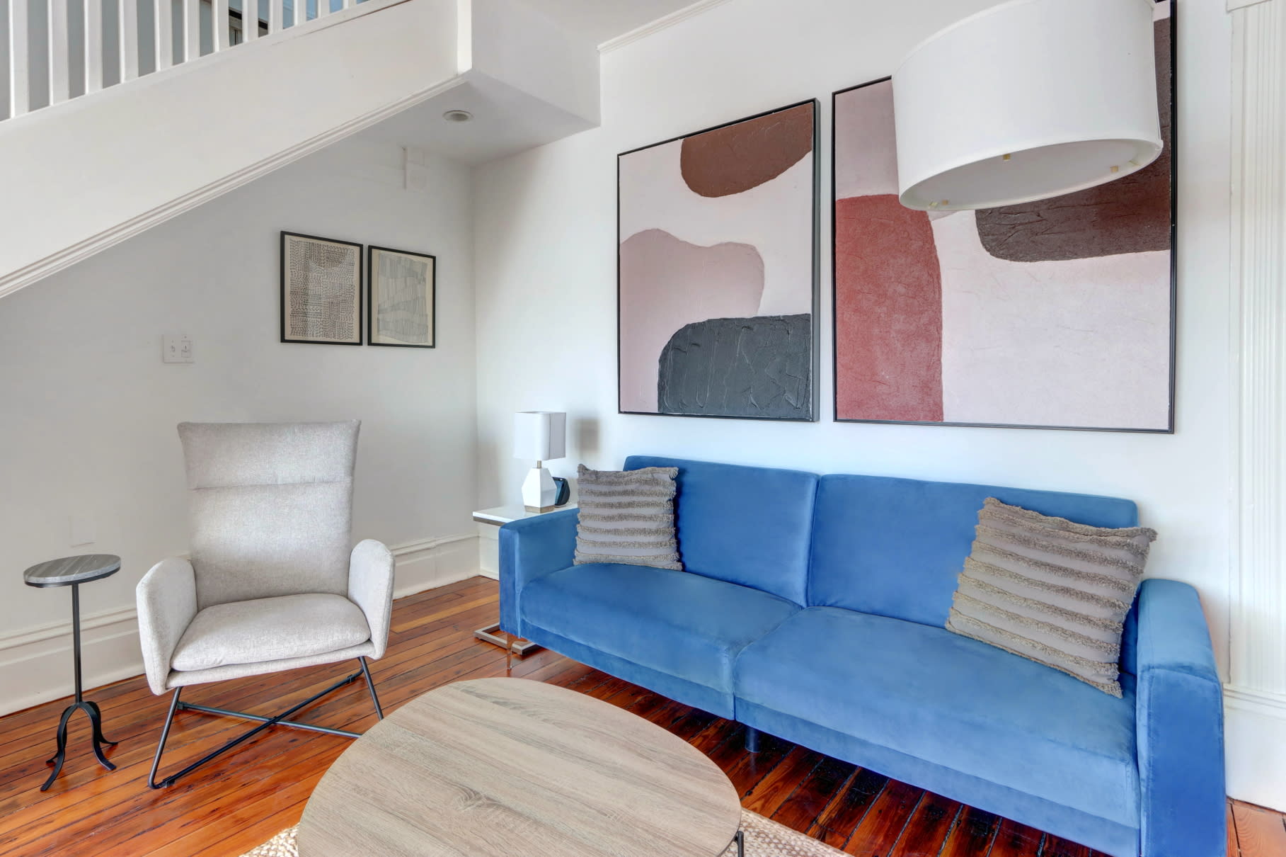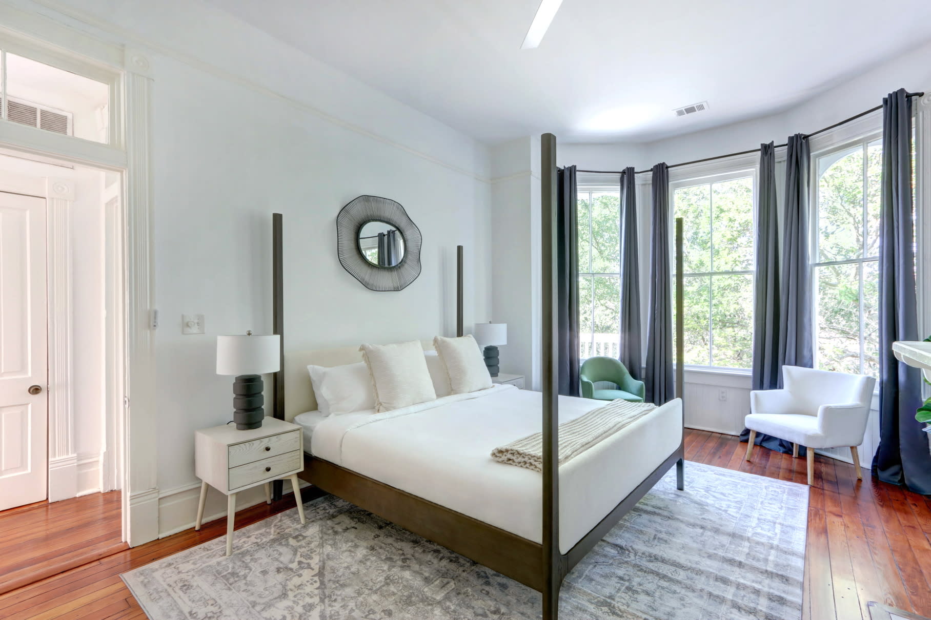 Enter the first level through the distinct yellow front doors and enjoy a flowing design from front to back. You will enter a long primary hallway on the first floor with beautiful original hardwood flooring. Directly inside, the primary bedroom features a king mattress with fresh linens and comfortable pillows. Large bay windows and a bedroom sofa provide the perfect seating area to relax, whether starting your day or unwinding at the end of the day.