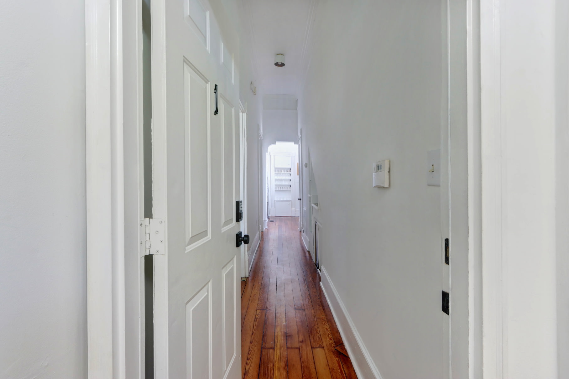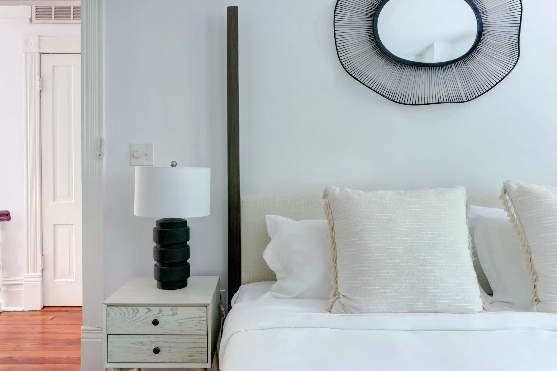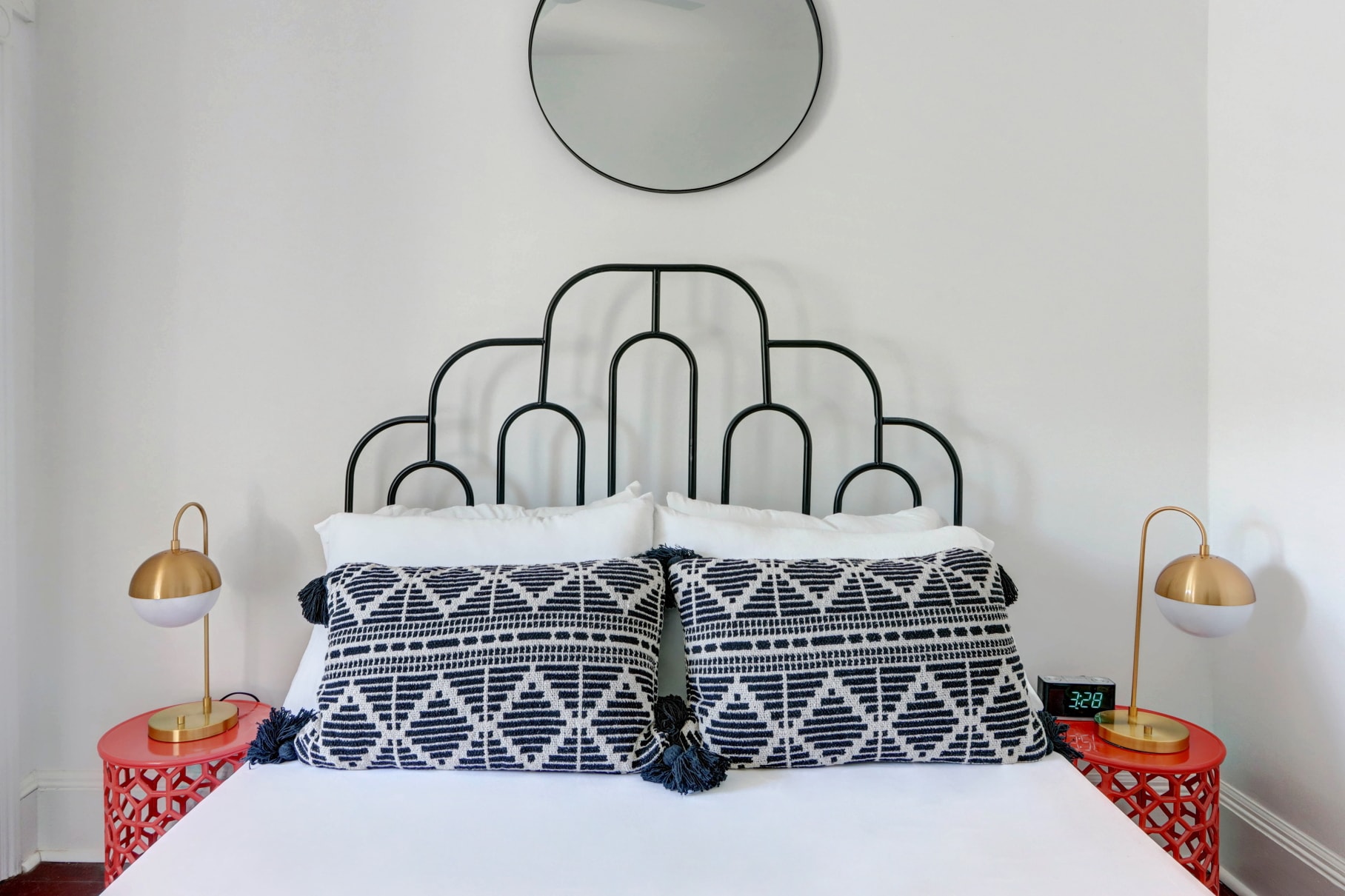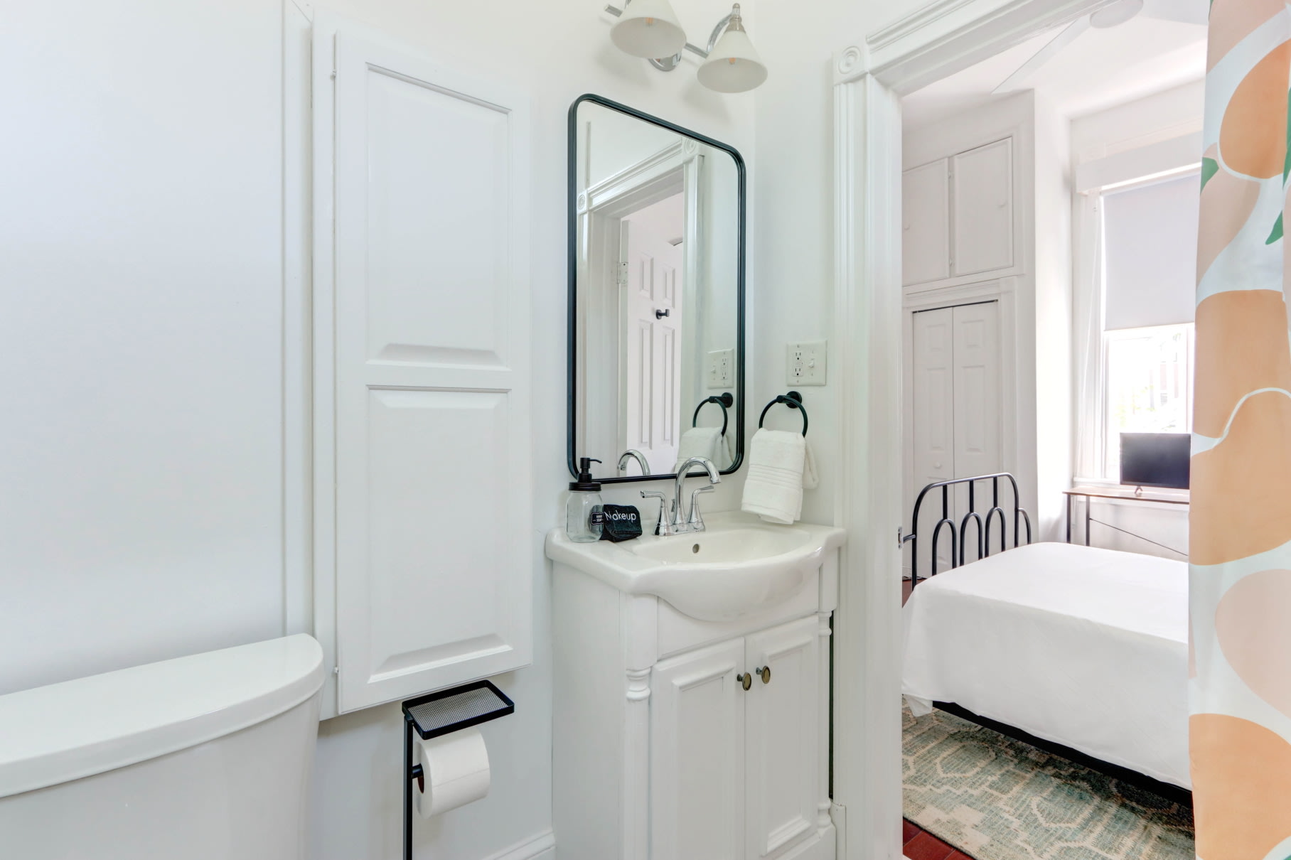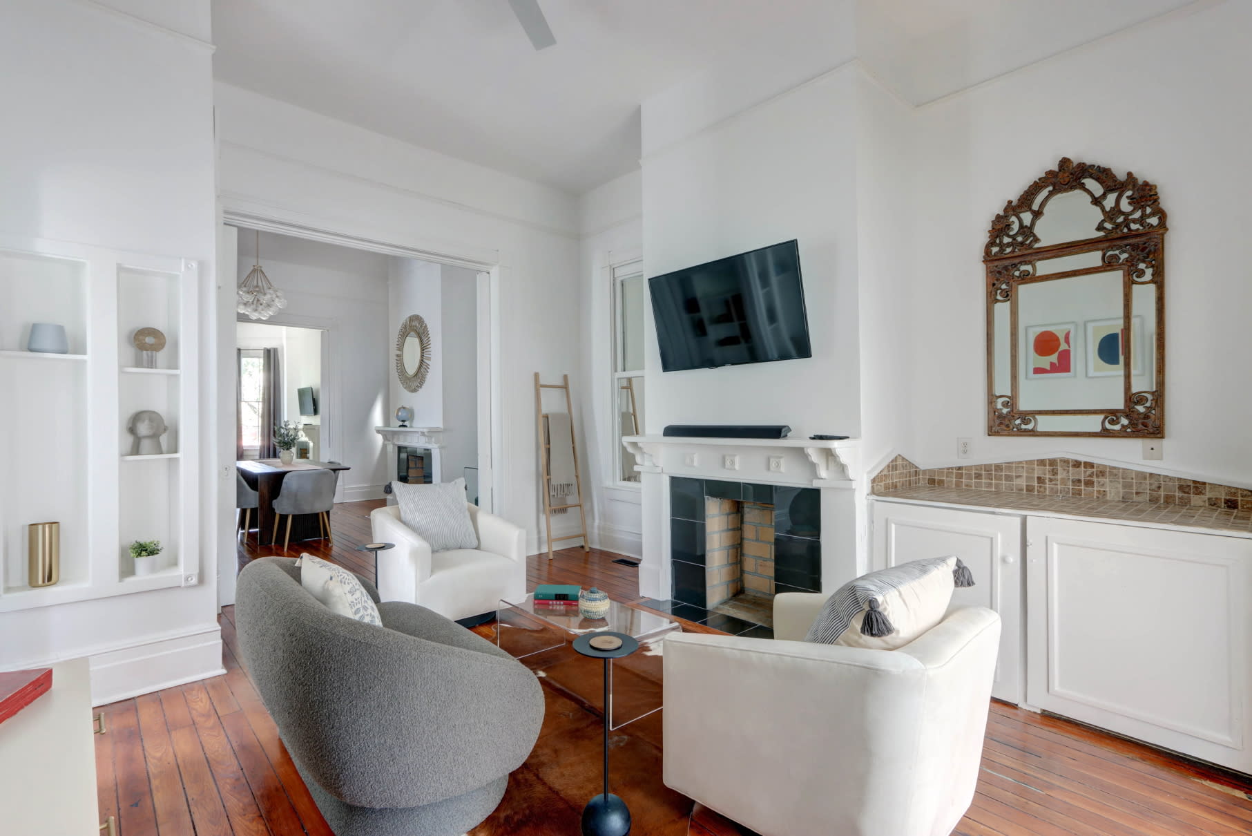 Enter the first level through the distinct yellow front doors and enjoy a flowing design from front to back. You will enter a long primary hallway on the first floor with beautiful original hardwood flooring. Directly inside, the primary bedroom features a king mattress with fresh linens and comfortable pillows. Large bay windows and a bedroom sofa provide the perfect seating area to relax, whether starting your day or unwinding at the end of the day.