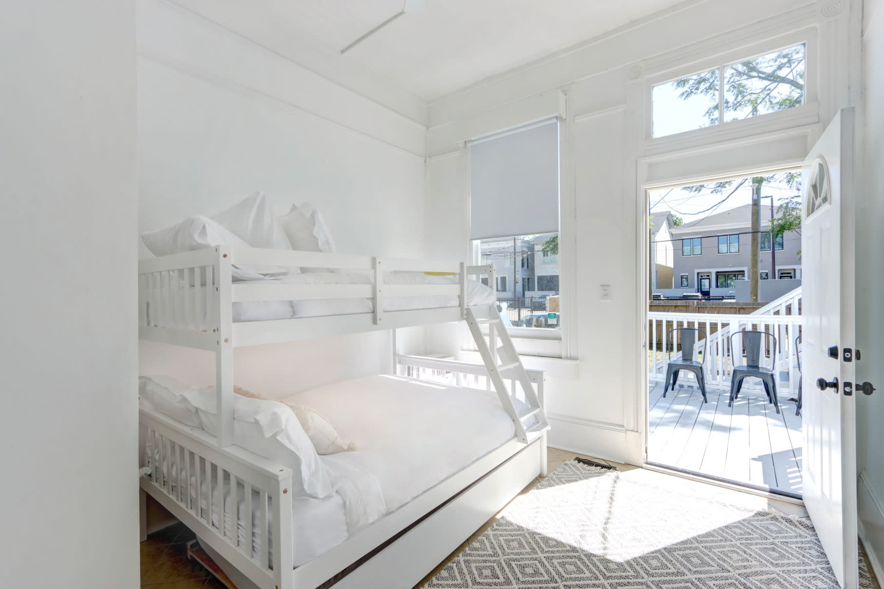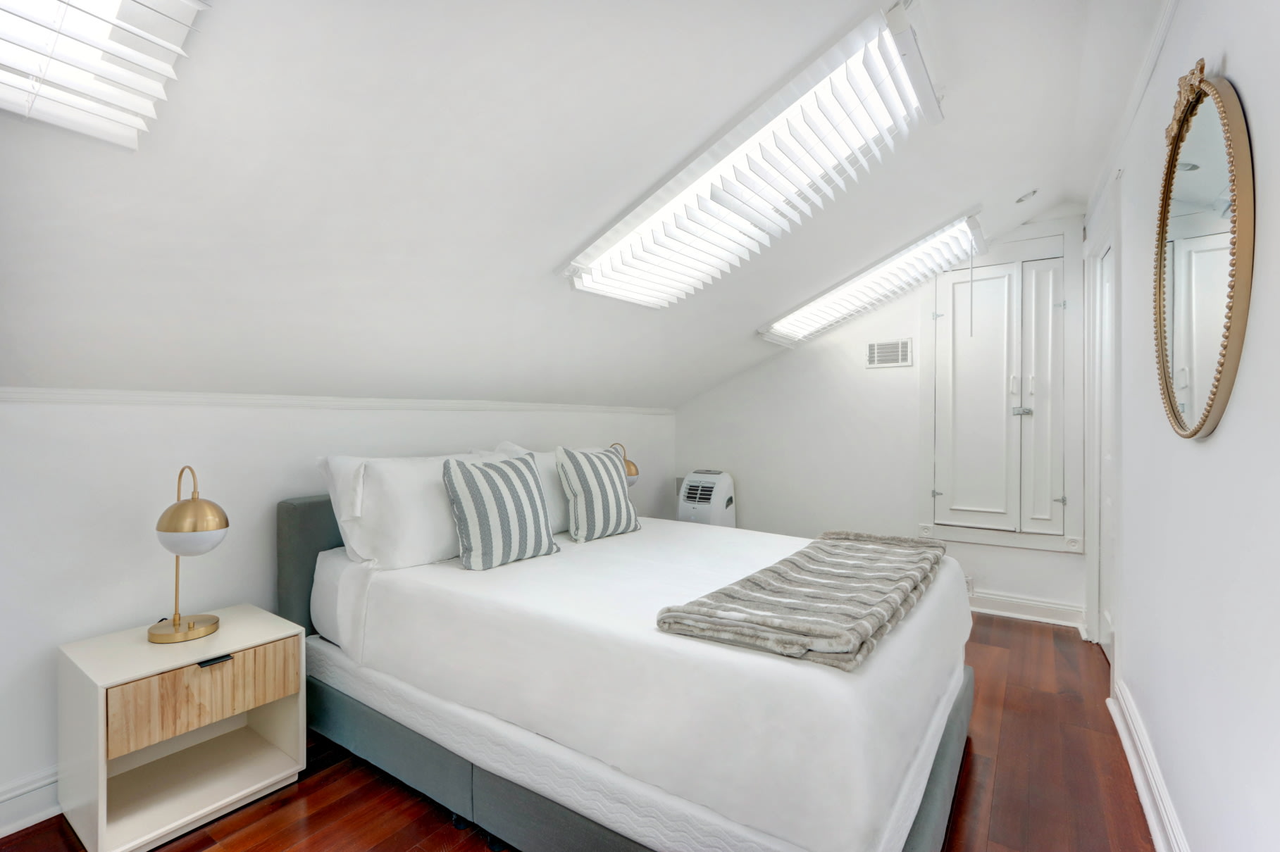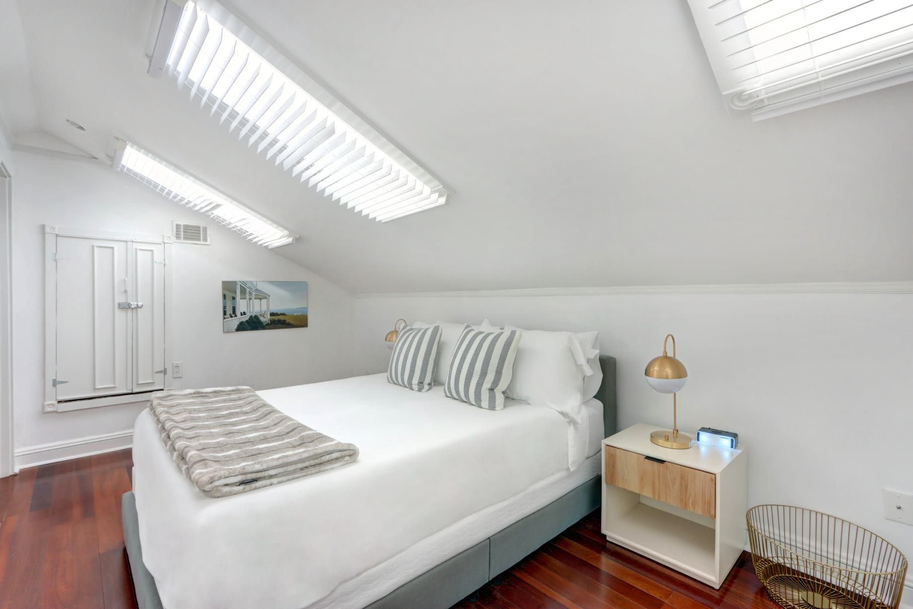 Head up another flight of stairs to find both bedrooms and the unit's bathroom. Directly at the top of the stairs is the primary bedroom featuring a new king mattress, comfortable linens, and large bay windows that fill the room with light.