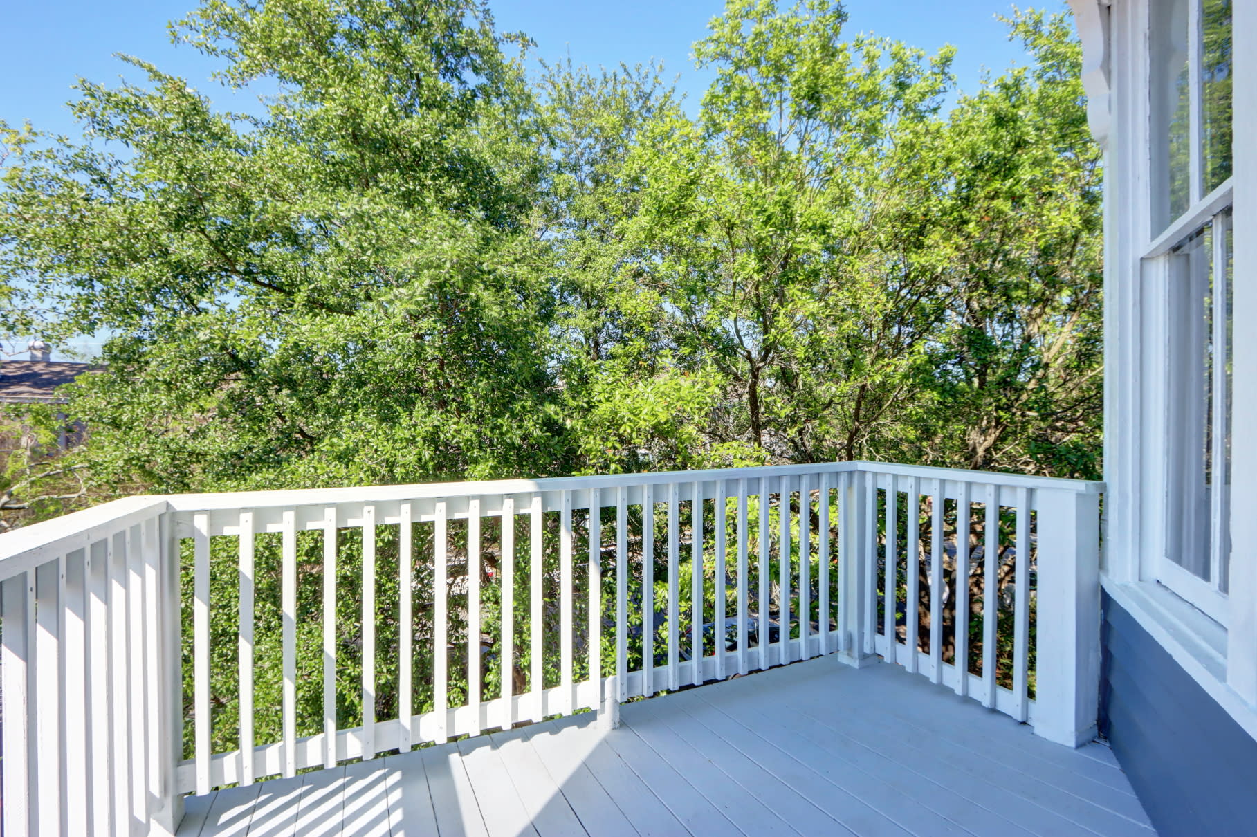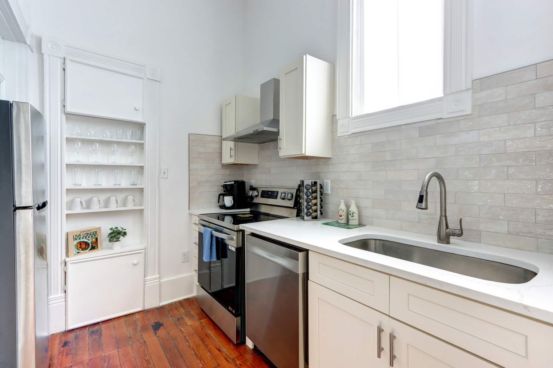 The living room opens directly to the kitchen featuring a unique design and is fully appointed, providing everything needed to cook, including pots, pans, and additional dishware. Large windows and a French door pour natural light into the space and open to the private veranda—a perfect spot for enjoying the Savannah breeze.