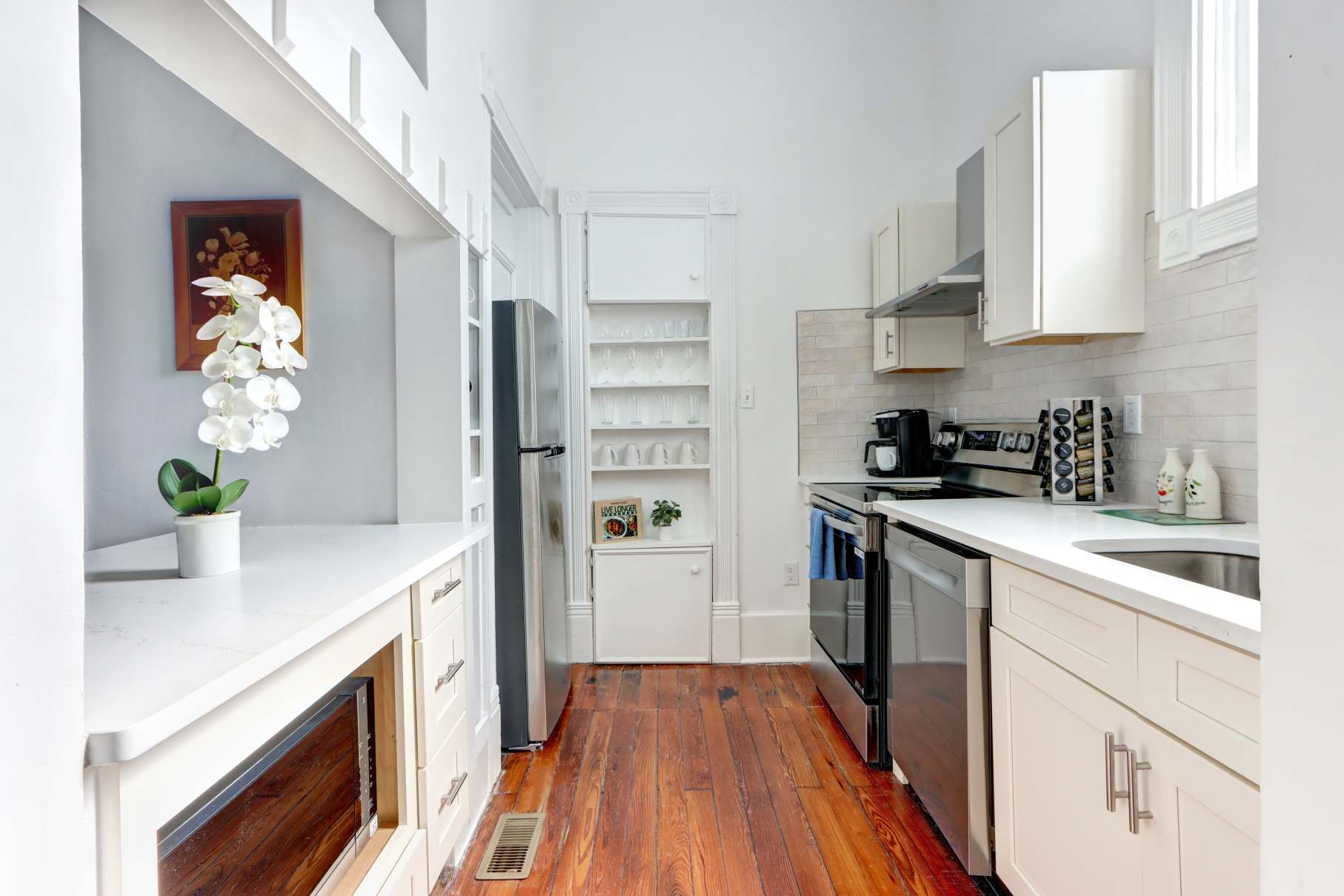 At the end of the hall is the first-floor galley kitchen featuring custom cabinets, granite countertops, and new appliances. The kitchen is fully appointed with everything you need to cook, including pots, pans, dishware, kitchen utensils, and small appliances.