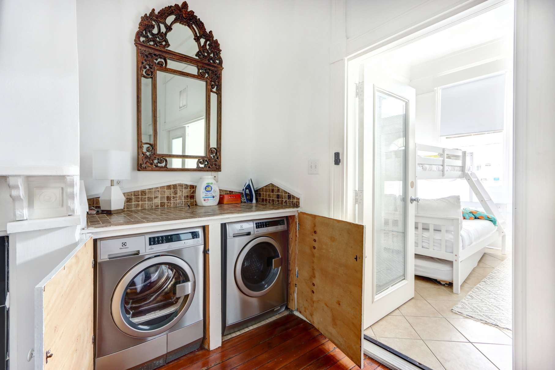 Off the dining room, you can enjoy a lovely living space with new comfortable furniture and a smart TV ready to stream your favorite shows. A washer and dryer are hidden in cabinetry below the TV for your use.