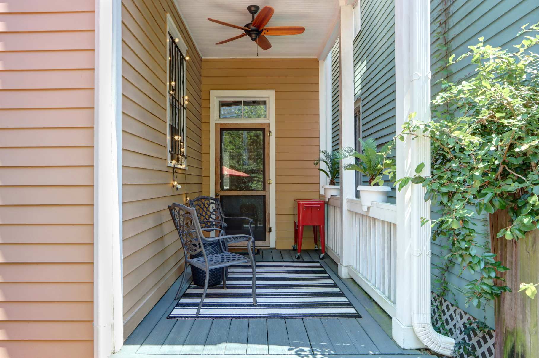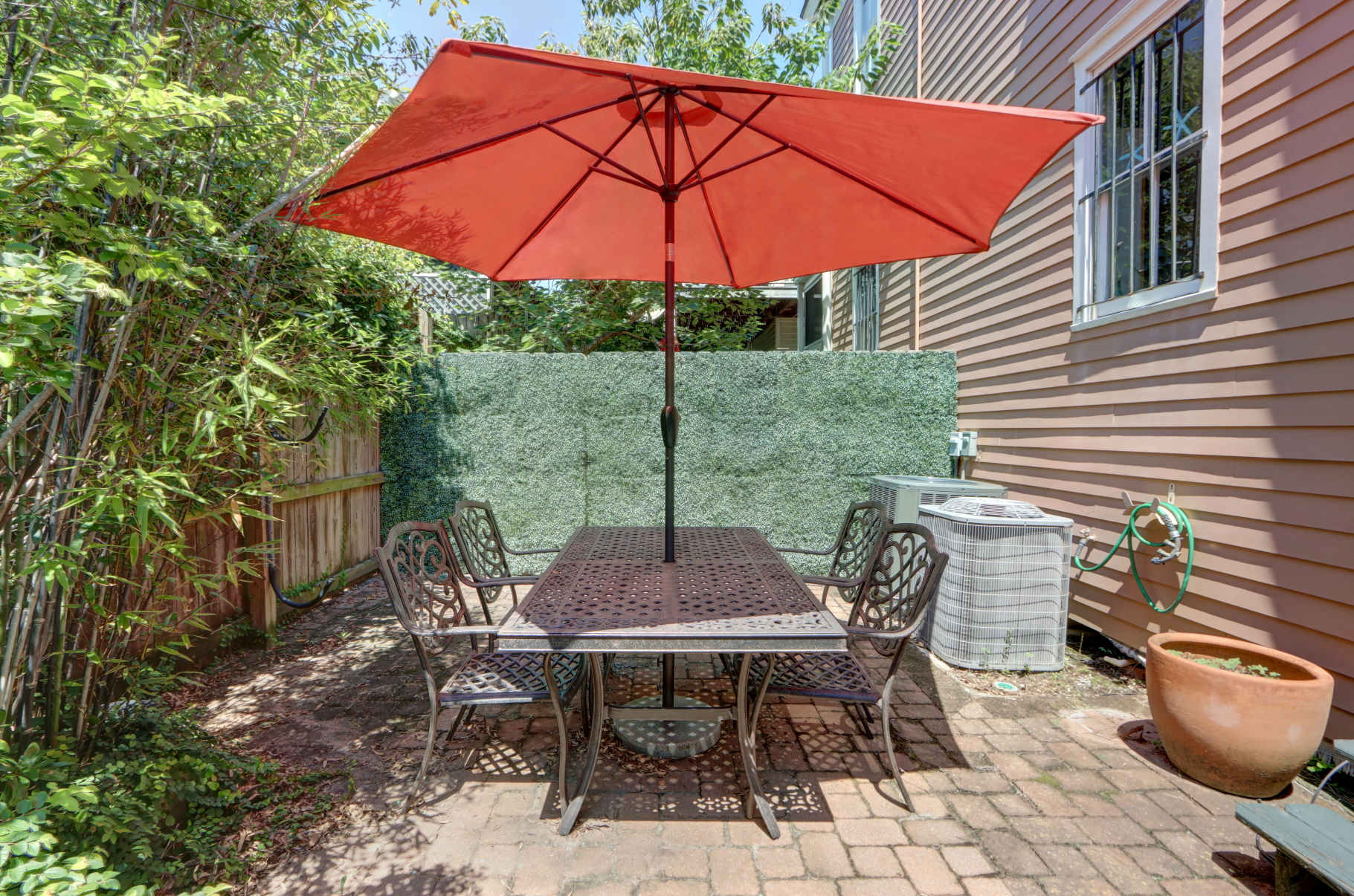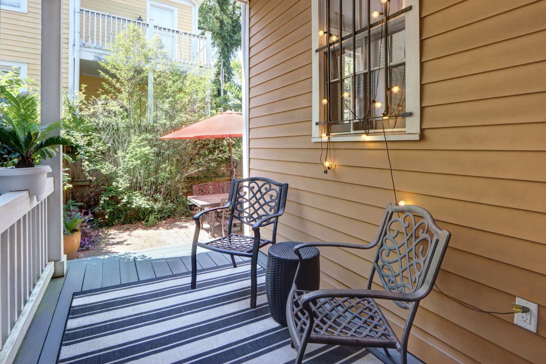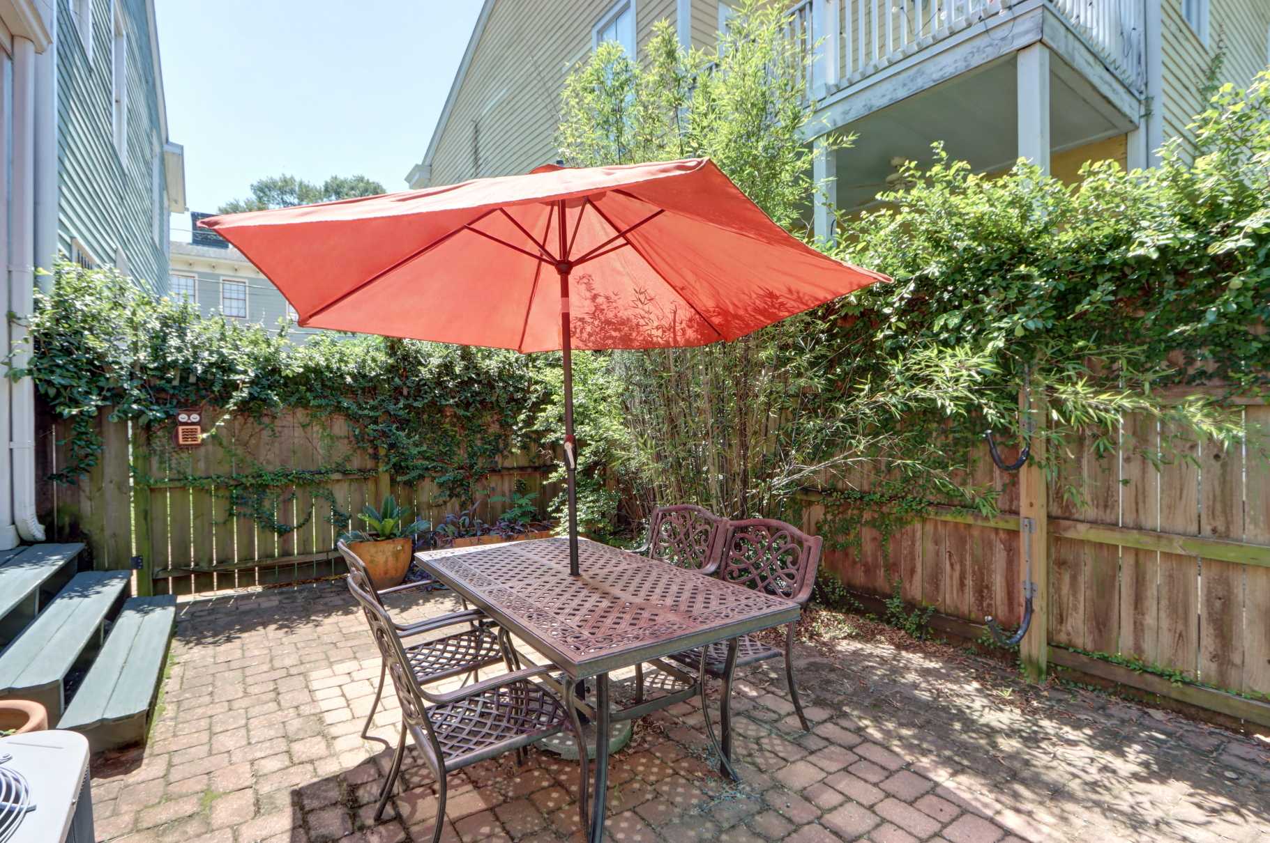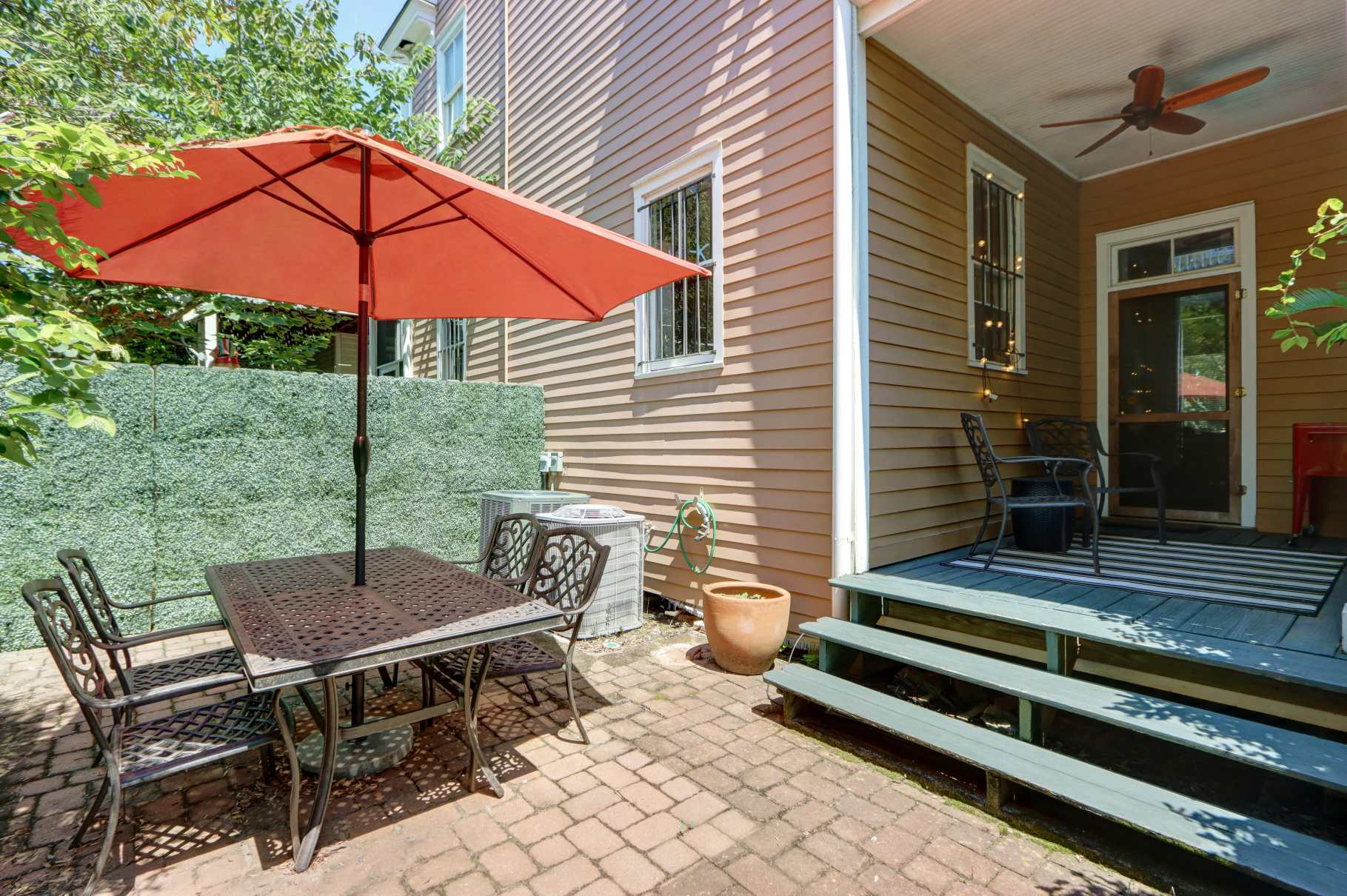 Private rear porch + fenced patio with table, chairs, and umbrella