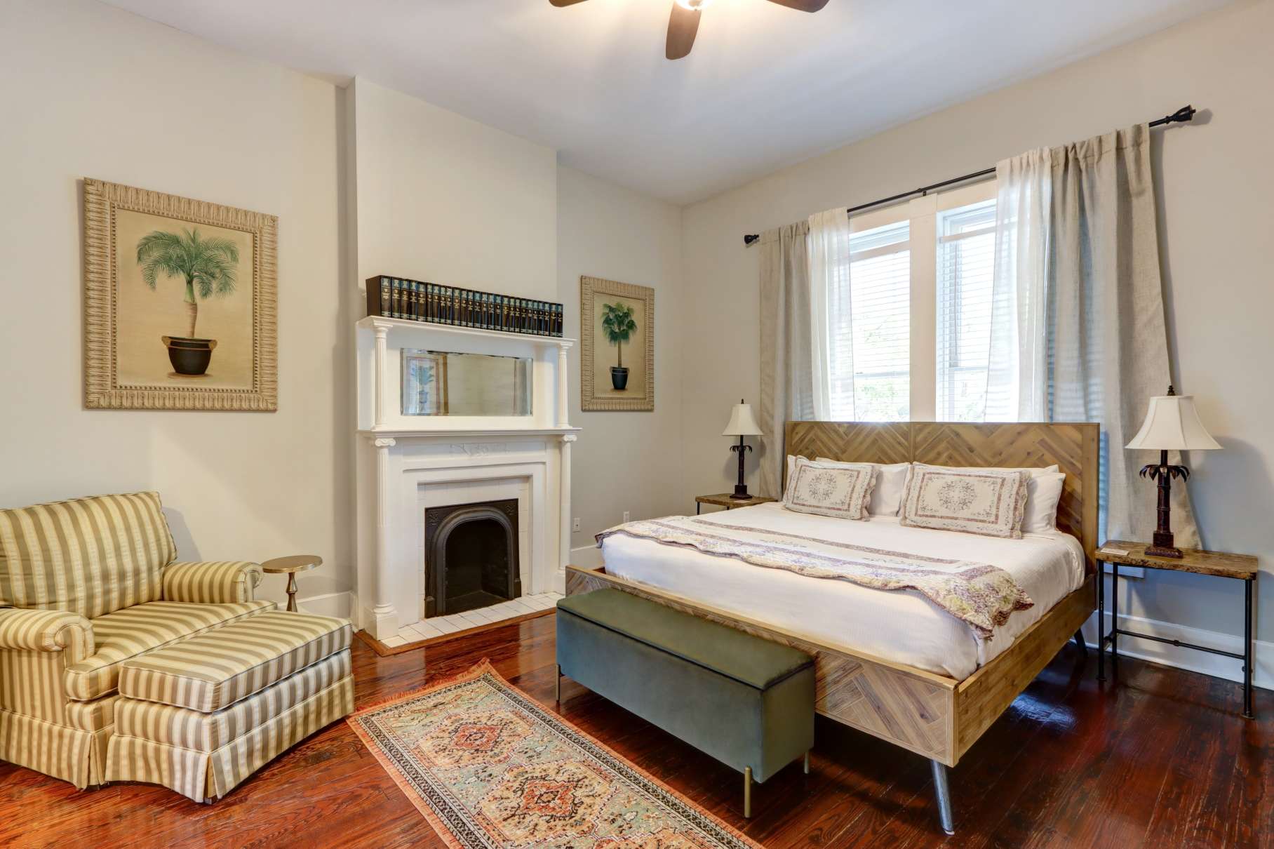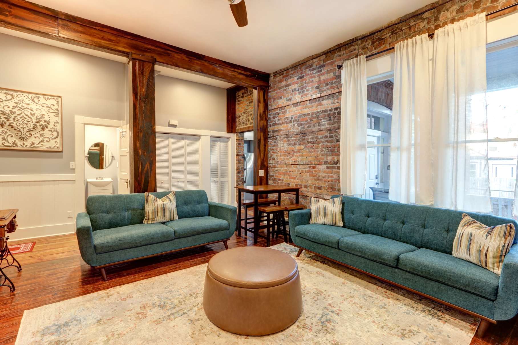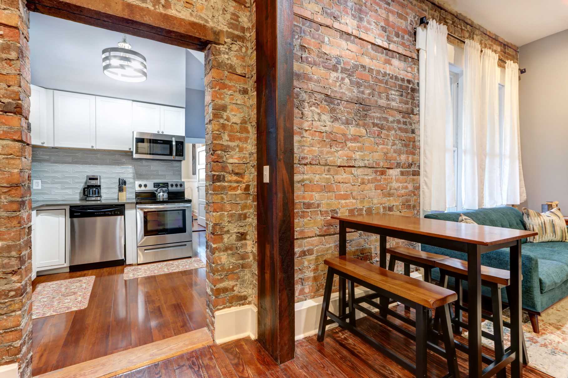 Step inside to find tall ceilings, original details, and contemporary design that feels both elegant and inviting. The living area features a cozy sitting space, smart TV, and bright natural light—perfect for relaxing after exploring Savannah’s cobblestone streets.