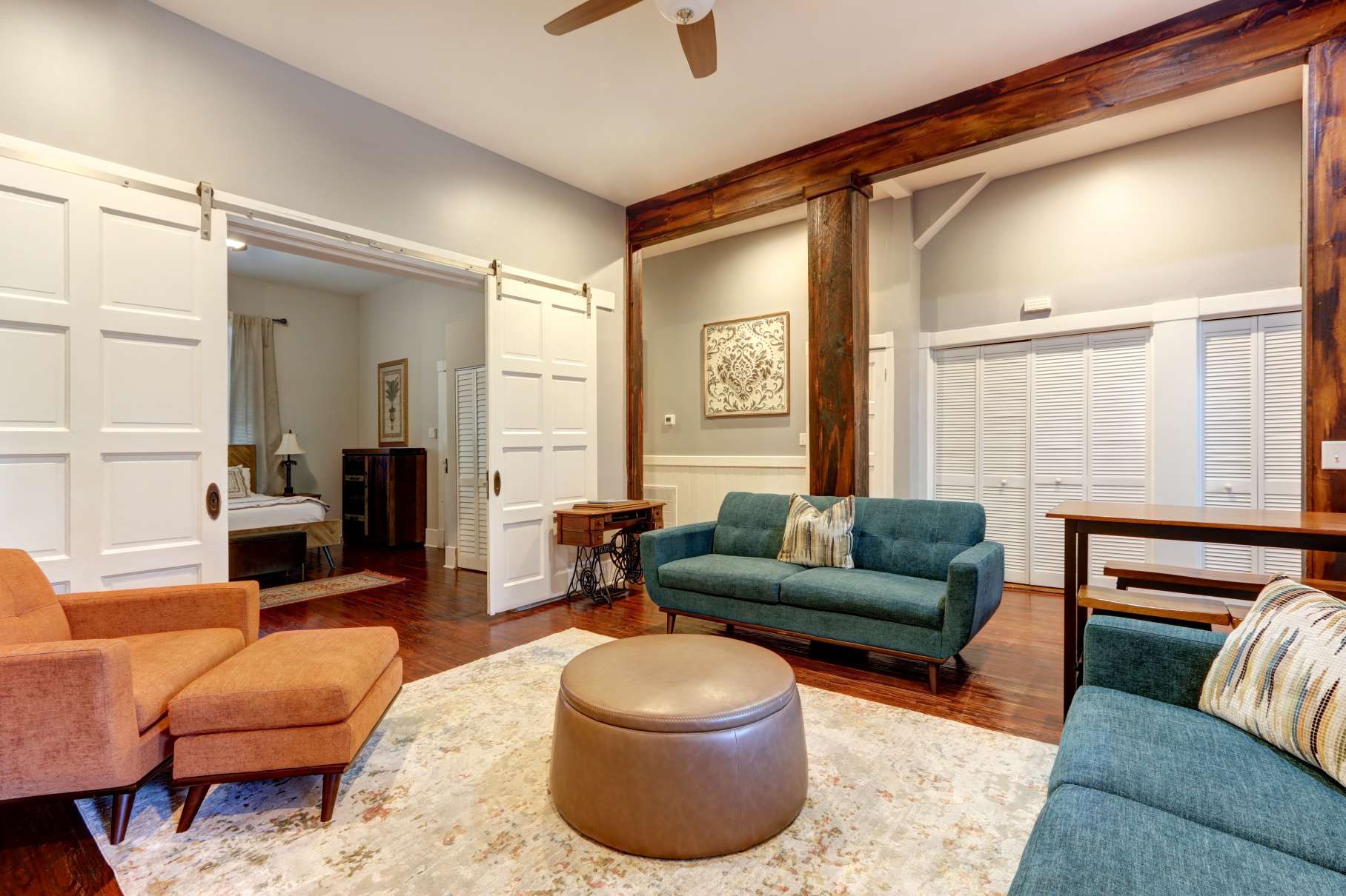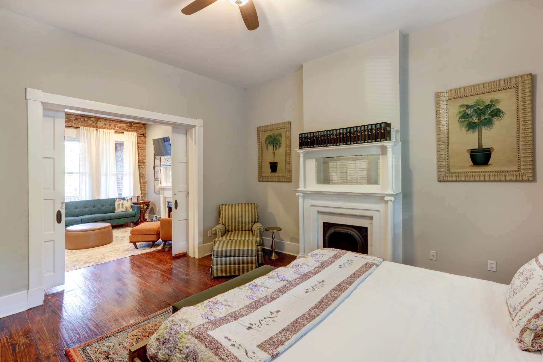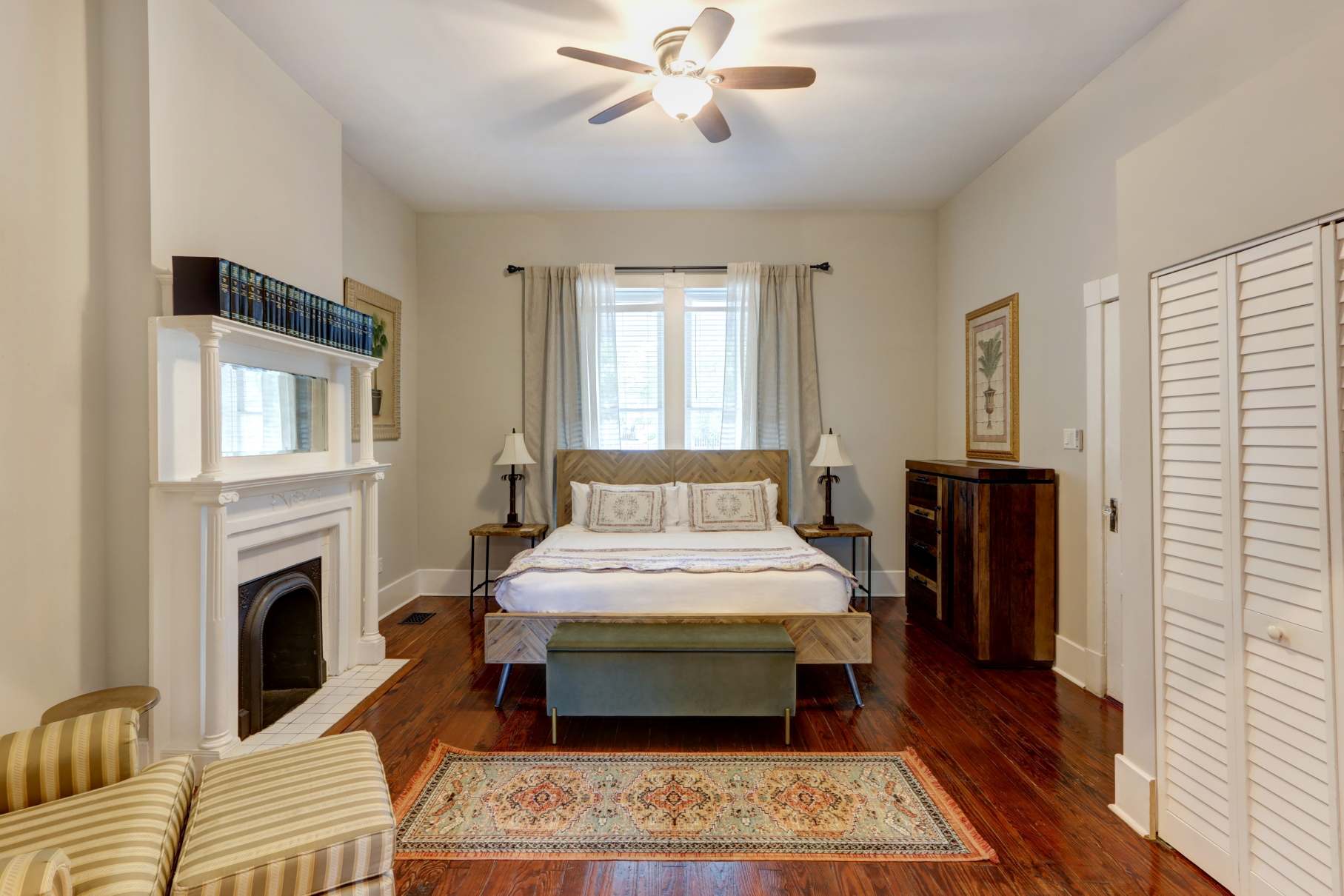 Step inside to find tall ceilings, original details, and contemporary design that feels both elegant and inviting. The living area features a cozy sitting space, smart TV, and bright natural light—perfect for relaxing after exploring Savannah’s cobblestone streets.